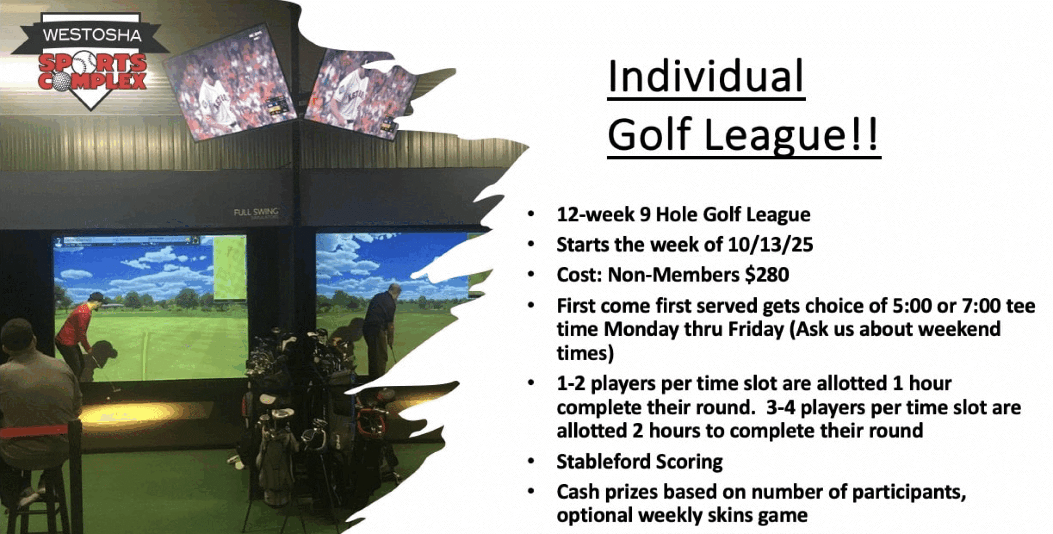 •12-week 9 Hole Golf League •Starts the week of 10/13/25 •Cost: $280 – Sign up below or call us at 262-885-6110 •First come first served gets…
