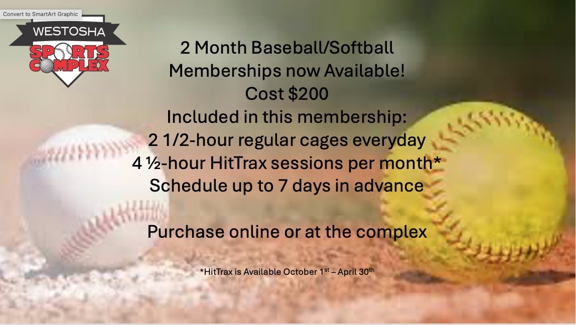 2 Month Baseball/Softball Memberships now Available! Cost $200 Included in this membership: 2 1/2-hour regular cages everyday 4 ½-hour HitTrax sessions per month* Schedule up…