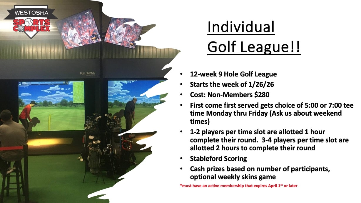 •12-week 9 Hole Golf League •Starts the week of 11/26/26 •Cost: $280 – Sign up below or call us at 262-885-6110 •First come first served gets…